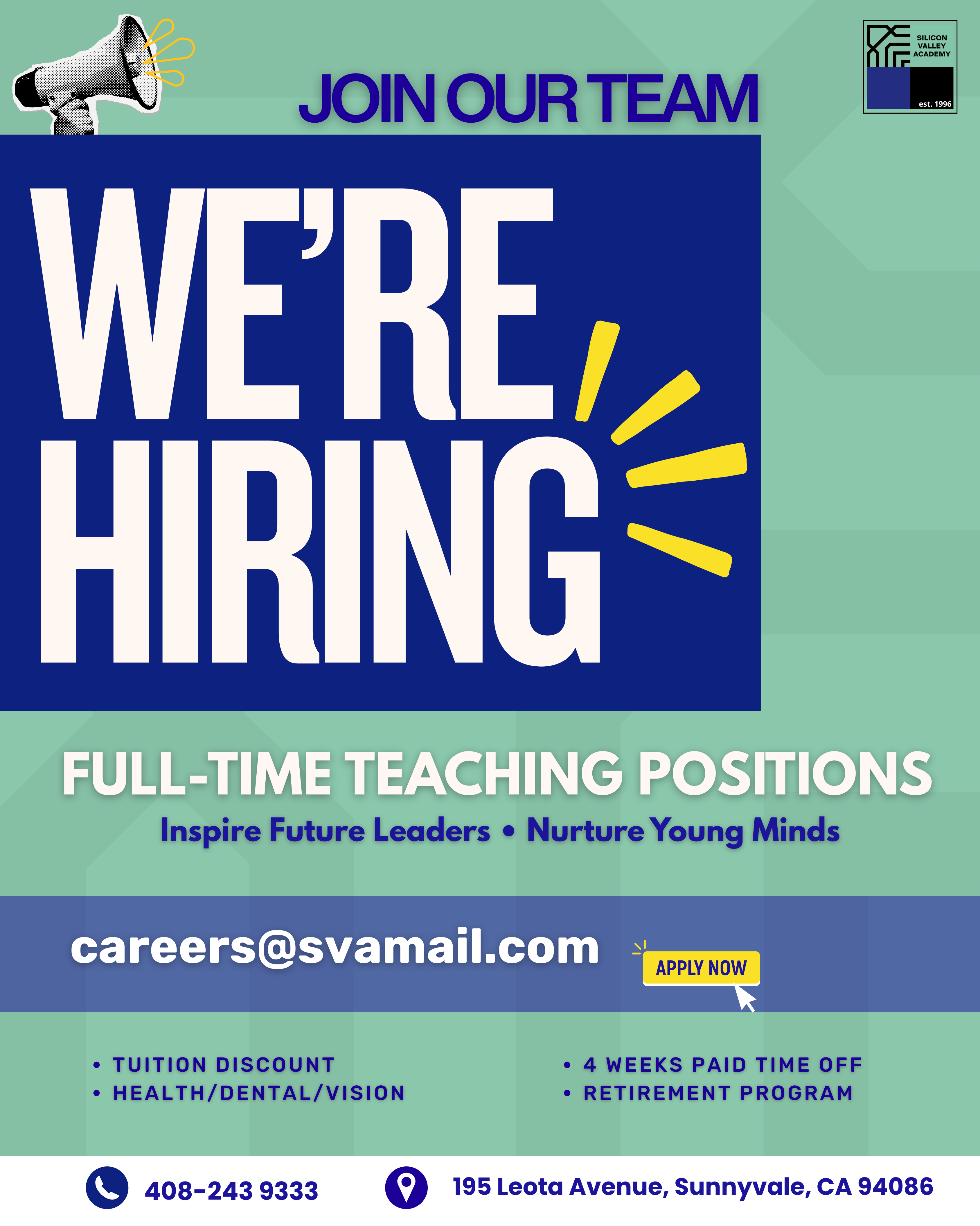 We have been part of the SVA family for more than 11 years, with all three of our kids attending the school. It has truly been a second home for us—a place where our children are supported, cared for, and raised in a healthy way, both physically and mentally. We feel so blessed to have such dedicated teachers who are always there for our kids and to be part of such a loving community.